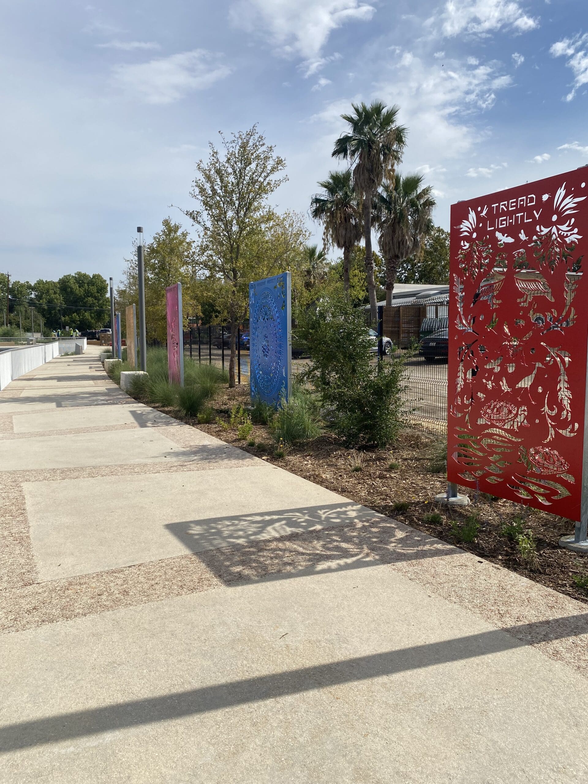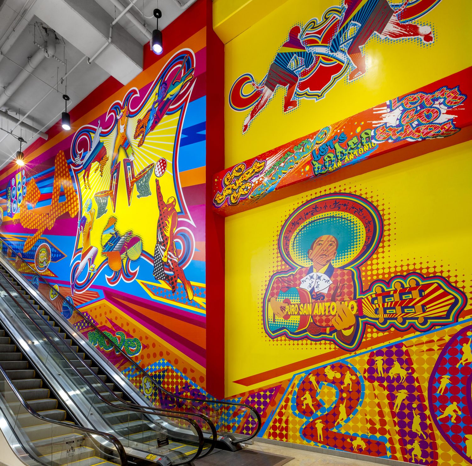 Elizabeth Carrington (she/her) is best known for vibrant pop art paintings, public art installations, and textile designs that combine graffiti-style lettering, playful imagery, layered collage, and bold graphic color. Her work has been described as “active message art with subliminal messages of hope,” exploring cultural narratives while paying homage to eras of social change. Sometimes whimsical and occasionally subversive, her practice is informed by a lifelong love of travel, music, nature, and action sports. Working across digital and traditional media, Carrington blends photography, graphic design, and hand-built processes to create depth and contrast. Her background in graphic design and art direction has brought her work onto diverse surfaces—from aluminum and textiles to large-scale architectural installations—requiring close collaboration with fabricators and engineers. Public art is central to her practice. She believes art in shared spaces can transform daily experience, spark connection, and foster moments of joy, reflection, and community.
