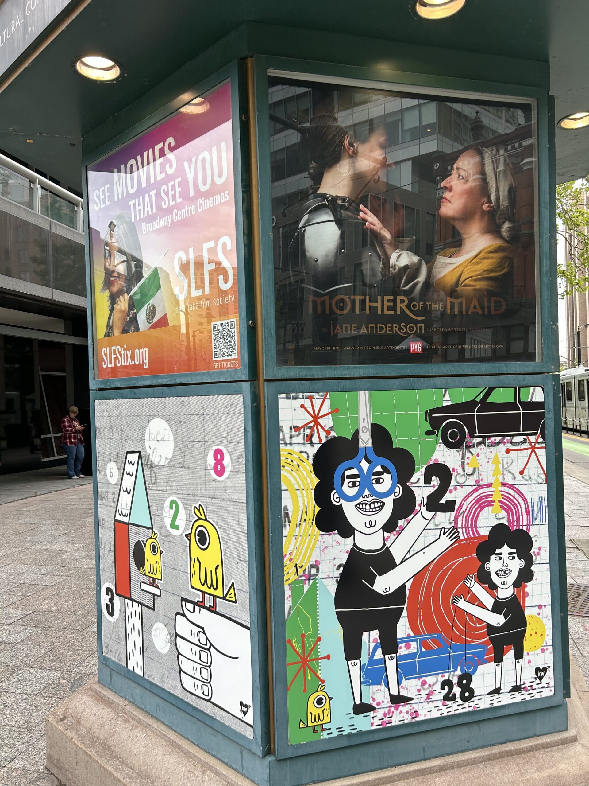 Kate Wolsey (she/her) is a multidisciplinary artist whose work is inspired by mid-century design, skateboard culture, and children’s art. She is known for a simple, graphic, and playful style that combines bright colors, quirky characters, bold typography, and layered visual elements found in everyday life. Recent projects include a mural for an international tech company (name NDA-protected) and window installations for Mochi Kids in Salt Lake City’s 9th & 9th neighborhood. Her work has been featured in Hidden Waters, Exhibitions on Main, and a range of solo and group exhibitions.